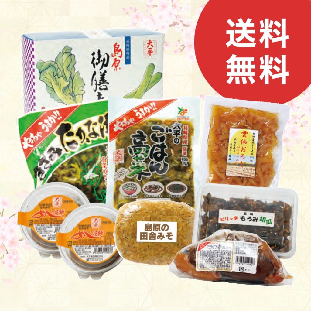 長崎名物めし泥棒 90g×2 / こうじ漬詰合せ(茄子、胡瓜、大根、生姜、もろみ共)400g / ごはん高菜 140g / 雲仙おろしはちみつ入 150g / ピリッ辛もろみ胡瓜 150g / 島原の田舎みそ 300g / きざみたかな漬 150g