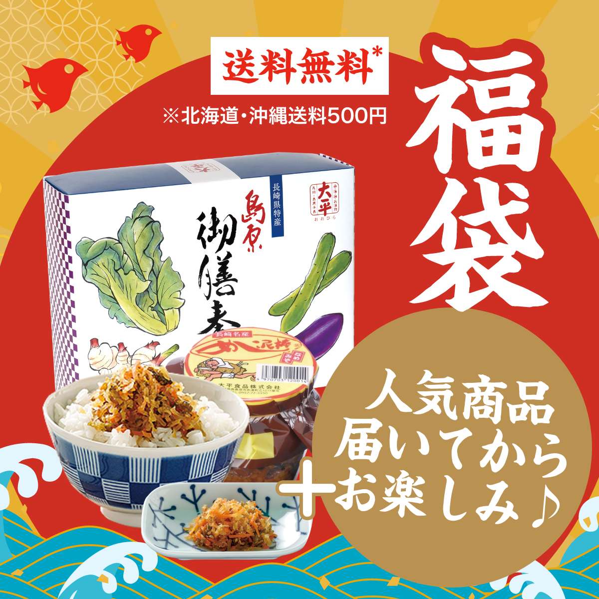今年1年も良い年でありますように…♪大平食品の人気商品3点と届いてからのお楽しみ商品が詰まった1月限定販売の福袋!送料無料ですので、他商品と一緒に買っていただくとお得です。