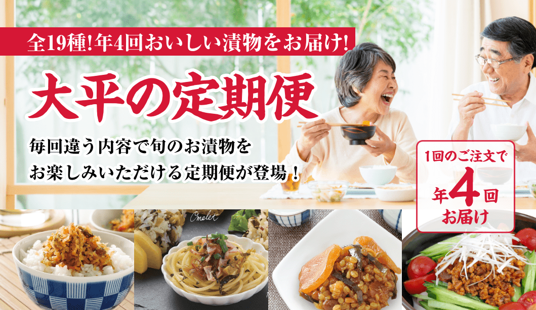 大平食品のおいしさを1回のご注文で年4回お届け。旬のお漬物をお楽しみいただける定期便商品が登場しました。